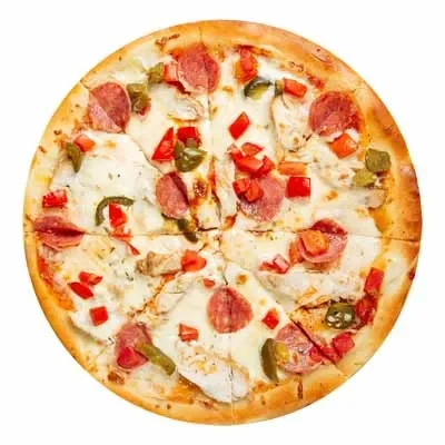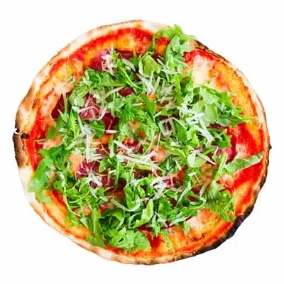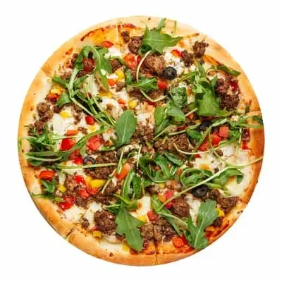 Mozzarellaost, champinjoner, lök, paprika, oliver, vitlök, kronhjärta, soltorkade tomater, ruccola